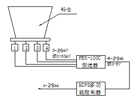 MIPS儀表將來自FBX-100C毫伏變送器的標(biāo)準(zhǔn)電流信號進(jìn)行I/V變換,A/D轉(zhuǎn)換轉(zhuǎn)成數(shù)字量,而后去皮重,按預(yù)置的數(shù)學(xué)模型和有關(guān)參數(shù)計(jì)算出料倉中物料的重量。一方面在面板上顯示出來,另一方面以標(biāo)準(zhǔn)的4~20mA電流信號將此料倉的噸位傳給DCS(或其它種類的上位機(jī))。